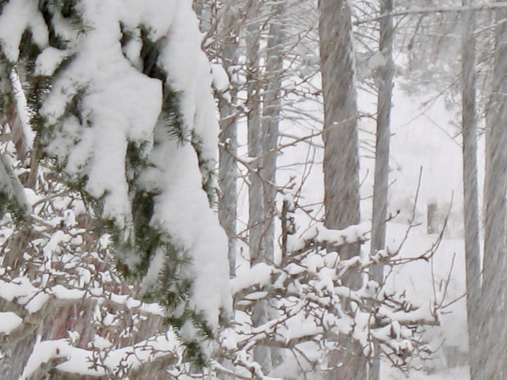 It begins to snow. Thick heavy snowflakes, curled like feathers. In minutes the sky disappears into whiteness.