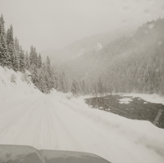 This daughter is driving, talking to her dad up front beside her, laughing, unafraid, brave. They’re a lot alike. She drives straight into it, the road deserted, our tires making the first tracks, wipers barely keeping up. We can just make out the gray forests on each side of the road, the foggy rivers dark and winding, hinting where the road is, guardrails piled high already with snow verifying it. There is no place to stop or stay along this route, just 100 miles of deep woods.