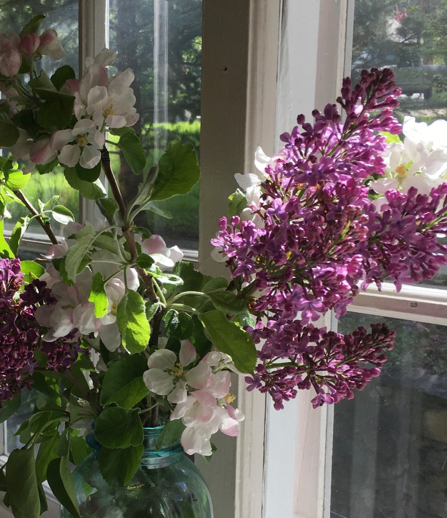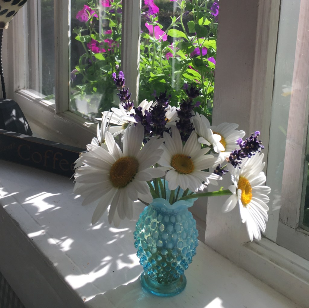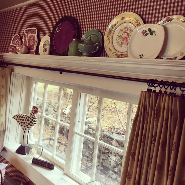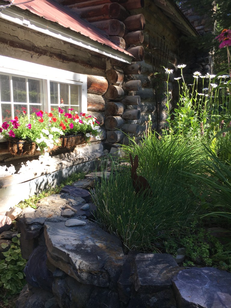 Actually, I’ve come to appreciate this layout detail. While the lake and mountains on the other side of the cabin fill the east-facing windows, this is my window to the world. Folks going to work and school, morning and evening walkers, delivery trucks and visiting neighbors. I can get lost in my thoughts for days on the other side of the cabin. This window brings me back, urges me out. I decorate it with old plates and my polka-dot rooster standing watch inside. I poke red twigs into the dirt of the empty window boxes outside in fall and winter. Come spring there will be the first apple blossoms and lilacs in a blue jar on the sill, then Shasta Daisies, Peonies, and finally Golden Glow at summer’s end. It seems I mark the turning of each year in this window, for myself and my fellow travelers.